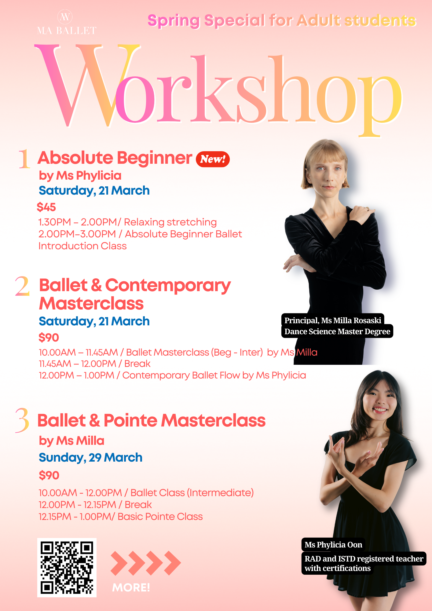 Join Ms Milla for an inspiring Ballet & Pointe Masterclass on Sunday, 29 March. The session begins with an intermediate ballet class from 10:00 AM to 12:00 PM, followed by a short break, and concludes with a focused basic pointe class from 12:15 PM to 1:00 PM. This masterclass is designed to refine technique, strengthen fundamentals, and introduce the essentials of pointe work—all for $90.